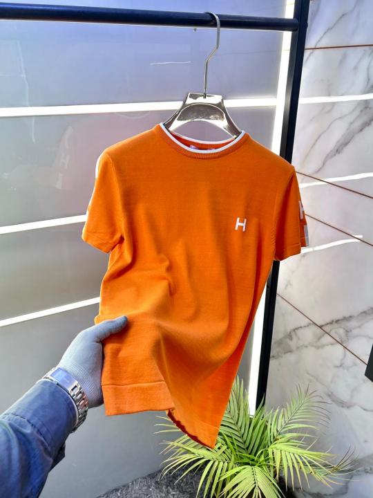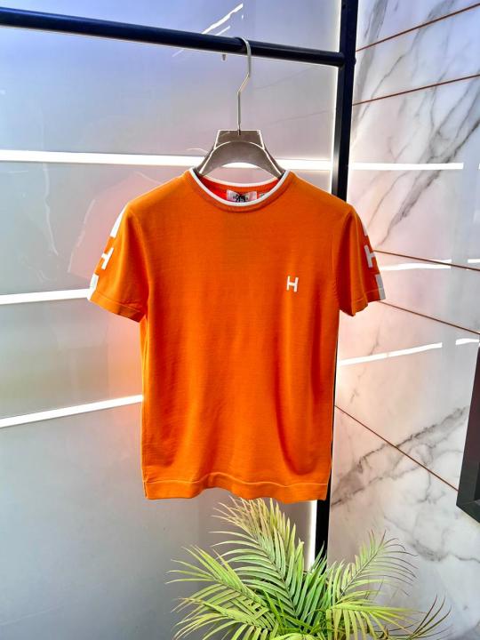 Home T-Shirts Hermes Logo Imported Orange knitted Polo Super Premium Round Neck T-shirt F3528-OR